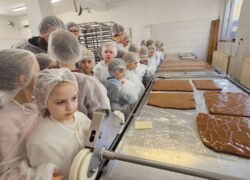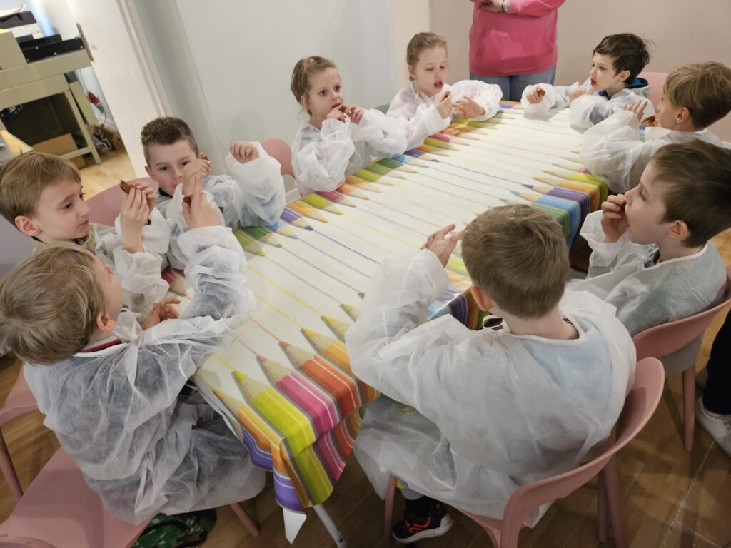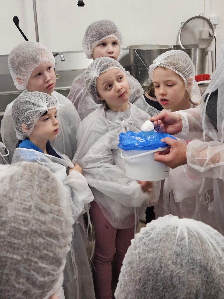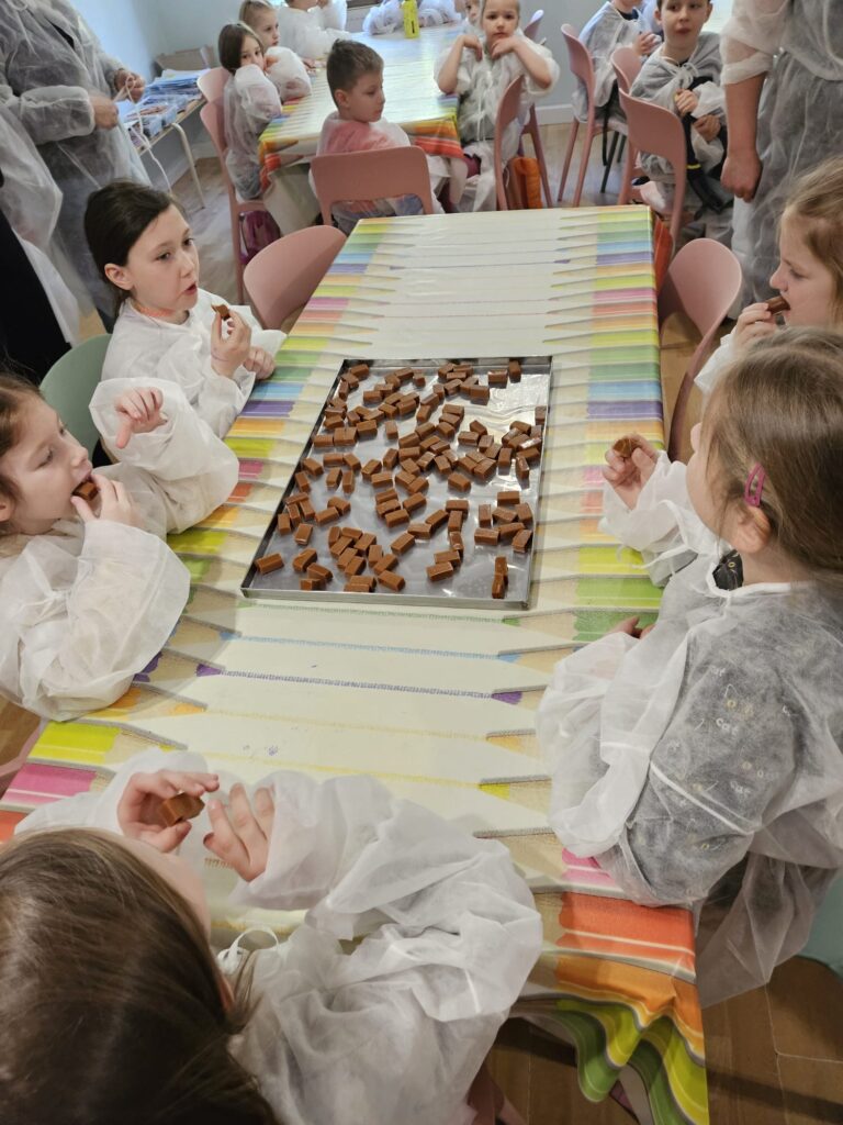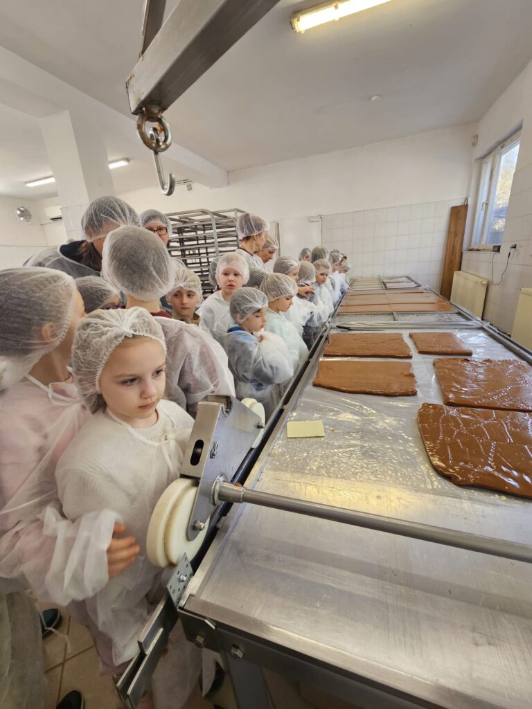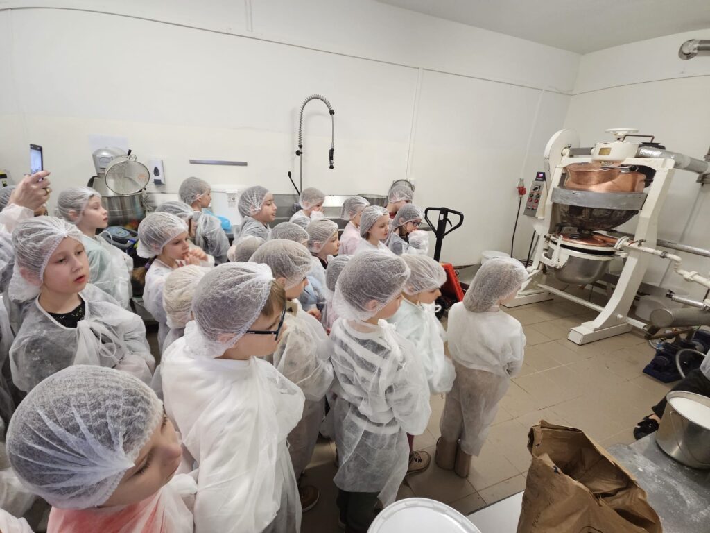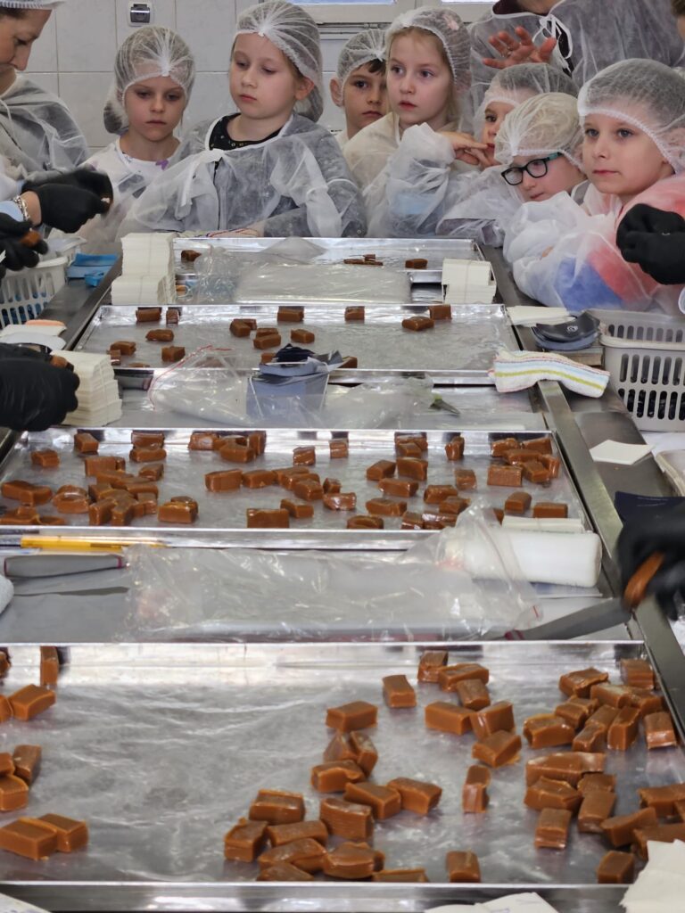 Klasy 0–1 były na pieszej wycieczce w Fabryce Krówek w Grodzisku Mazowieckim. 🍬 Podczas zwiedzania dowiedzieliśmy się, jak powstają słynne krówki oraz jak są ręcznie zawijane w papierki. Okazało się, że każda z pań pracujących przy zawijaniu potrafi zapakować od 3 do nawet 5 tysięcy krówek dziennie w ciągu 8 godzin pracy! Dzieci miały także okazję wykazać się kreatywnością – mogły zaprojektować własną etykietę na krówkę, a następnie samodzielnie zawinąć ją w papierek. 🍭 Na zakończenie nie zabrakło tego, co dzieci lubią najbardziej – degustacji świeżej, pysznej krówki. To była bardzo słodka i ciekawa wycieczka! 😊